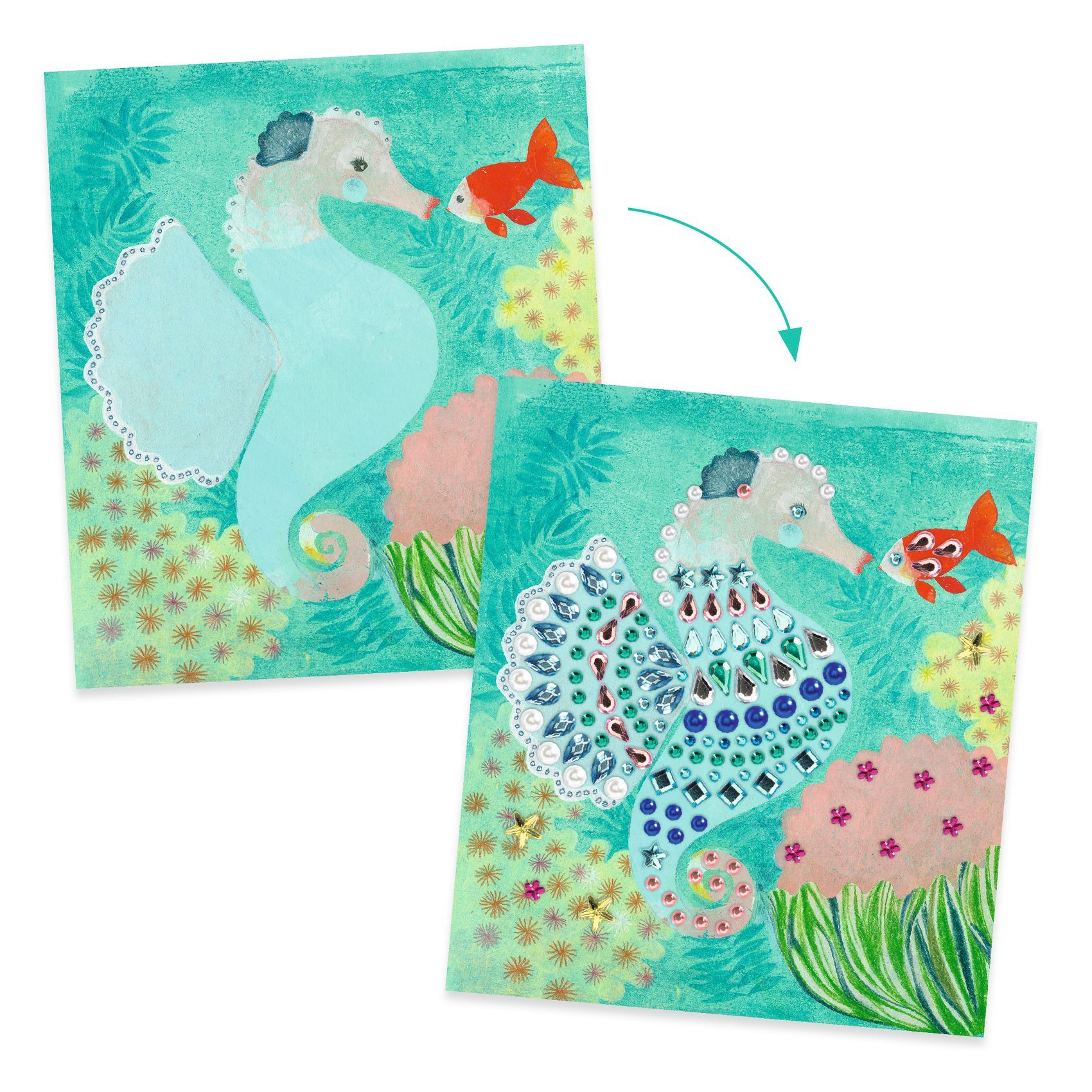Ce kit propose d’embellir 4 cartes illustrées avec une multitude de mini diamants facettés aux formes et aux couleurs variées. Chaque planche de strass correspond à un tableau à décorer. En suivant le pas-à-pas proposé, l’enfant donne progressivement du relief et de la brillance aux tableaux et sublime les créatures illustrées.