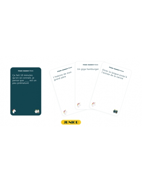Un joueur est désigné « question master » et lit une carte bleue avec une phrase à trou(s), tous les autre joueurs posent une carte blanche. Celui qui a posé la carte la plus drôle gagne la manche puis lit la carte bleue suivante et ainsi de suite. Le premier joueur à 5 points est l’heureux vainqueur !