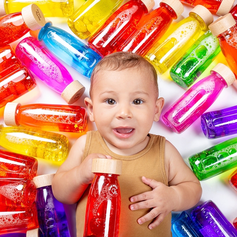 Lumière, couleur et magie. L’arc-en-ciel à portée de main. Avec ces flacons inspirés de la palette chromatique de la nature, les enfants découvrent les couleurs, s’émerveillent devant la lumière et stimulent leur concentration tout en trouvant leur moment de calme.