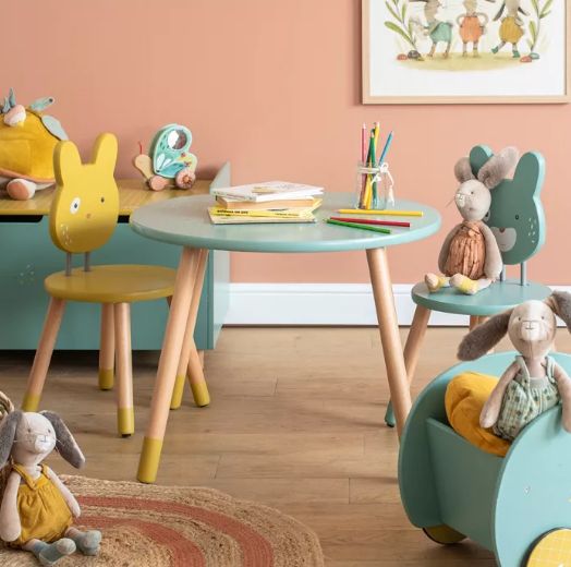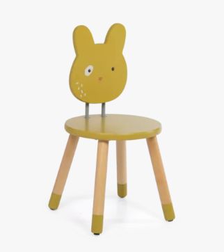 Chaise ocre en bois peinte, avec pour dossier, l’un des trois petits lapins ! Idéale pour accompagner la table, elle servira aussi bien dans la chambre qu’au salon !