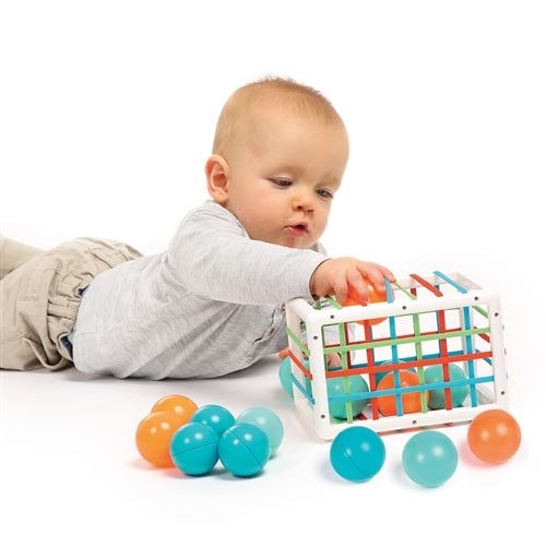 Un cube surprenant avec des élastiques qui enferment 12 balles colorées au son rigolo. Ce jeu d’encastrement original développe la préhension, la logique et la motricité fine.