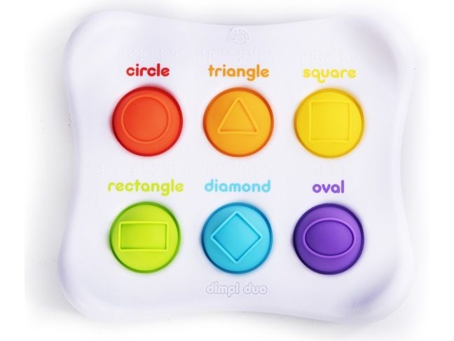 Sur chaque bouton en silicone se trouve une forme géométrique, avec le mot correspondant en anglais et en braille en dessous. Lorsque vous retournez les boutons, les mots correspondent aux couleurs.