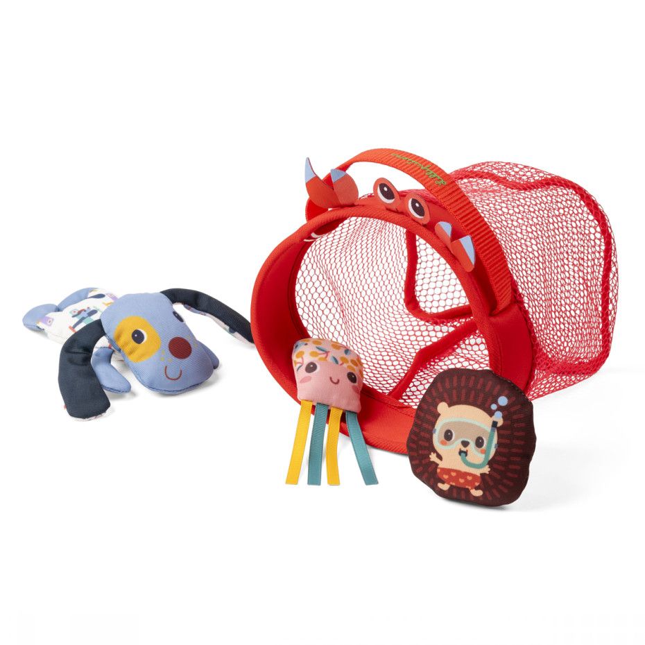 On ne pêche pas le crabe, c’est lui qui nous pêche ! Ce jouet de bain haut en couleur convient aux bébés dès 12 mois et aux enfants jusqu’à 6 ans et plus. Jules et ses amis adorent buller dans le bain, ils pourraient faire trempette pendant des heures ! Pour les en sortir, il faut bien souvent s’amuser à les repêcher ; et pour cela, rien de mieux qu’un grand filet ! Ce jeu de pêche pour le bain se compose d’un filet rouge en forme de crabe avec une poignée et de 3 personnages flottants (Jules le chien, Léon le hérisson et une méduse rose). Un jeu ludique pour se divertir à l’heure du bain, mais aussi pour développer sa coordination et son imagination. Pratique, la poignée du filet permet une bonne prise en main pour jouer, mais aussi de suspendre facilement le jeu et tout son contenu pour un rangement et un séchage optimal entre deux baignades ! Avec les plus petits, vous pouvez commencer par placer Jules et ses amis dans l’eau du bain et à les laisser flotter au gré des vagues : bébé les observe, les saisit, les repousse en bougeant … Pour un éveil sensoriel en douceur et un moment de détente sous le signe du jeu ! En grandissant, vous pourrez lui montrer comment pêcher avec le filet jusqu’à ce qu’il prenne plaisir à le faire seul et imagine de folles aventures aquatiques. Chaque petit personnage possède des caractéristiques différentes et stimulantes : Léon le hérisson est tout rond et facile à saisir pour les petites mains, la méduse possède de jolis rubans colorés, et les grandes oreilles de Jules flottent à la surface pour facilement le repérer ! Composé de polyester et de coton, ce jouet de bain Lilliputiens mesure 23 x 12 cm. Vous pouvez le rincer à l’eau claire et le laisser sécher à l’air libre après chaque utilisation, ou laver les accessoires en machine à 30° au besoin, en prenant soin d’utiliser un filet de lavage. A vos filets !