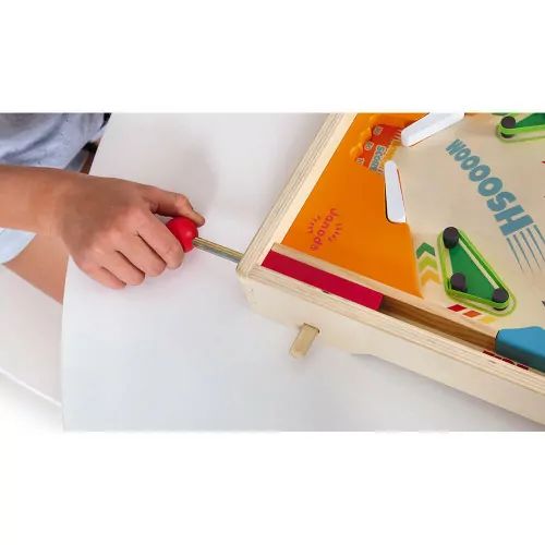 Magnifique flipper en bois naturel aux couleurs chaleureuses pour les nostalgiques des jeux rétro ! En le voyant, une seule envie, activer le lanceur et tout donner pour ne pas que la bille retombe en bas du plateau. Jouet en bois pour enfants de 5 ans et plus qui développeront concentration et vivacité ! Roulettes et bandes élastiques permettent d’engranger des points bonus ! On lance la bille en métal pour faire sonner la cloche et c’est parti pour des heures de jeu en solo ou à plusieurs pour ceux qui aiment les défis ! Les 3 billes en métal incluses vous permettront de battre tous les records ! Un flipper pour enfant, c’est un jeu idéal pour s’entrainer à faire des additions en comptant les points et pour exercer précision et agilité. Le style rétro vintage de ce flipper ravira les enfants et ceux qui le sont restés ! A sortir pour animer les soirées jeux en famille ou entre copains et organiser un tournoi : celui qui marque le moins de points devra débarrasser la table !