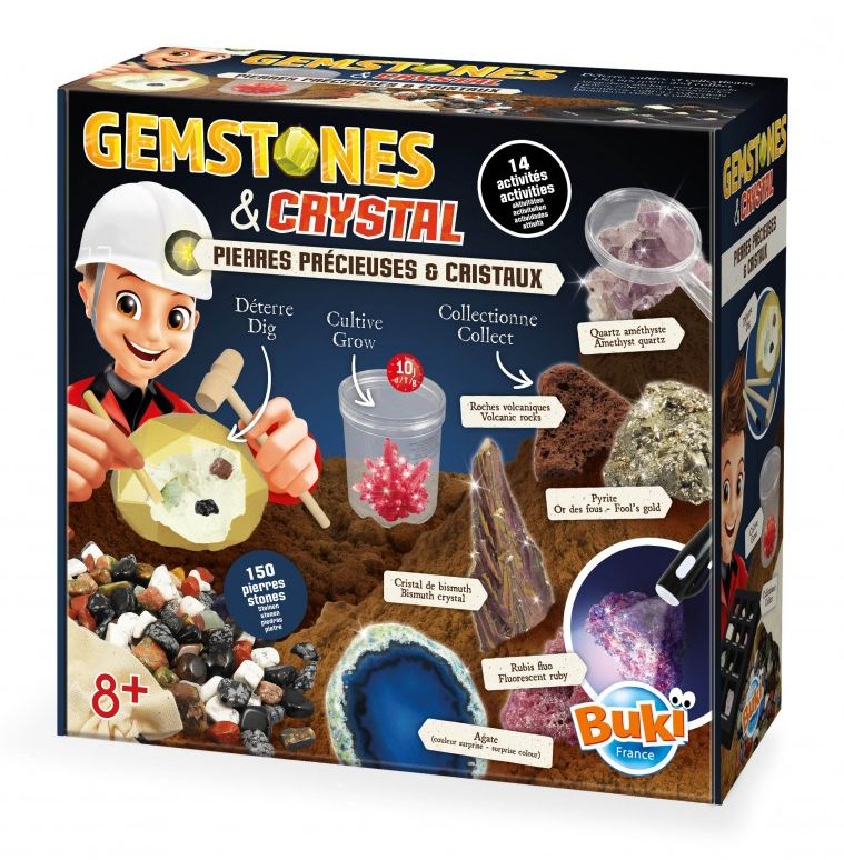 Deviens un expert des pierres précieuses et des cristaux avec les 27 pierres authentiques incluses. Réalise des expériences pour découvrir leurs propriétés. Avec les outils, déterre 8 véritables pierres brutes. Trouve leurs versions polies dans le sac (300 g) et compare-les avec la loupe.