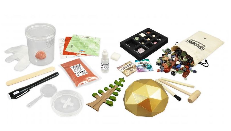 Fais pousser des cristaux géants et des cristaux instantanés. Observe une grande variété de roches remarquables : pierres volcaniques, quartz, or des fous, roche fluorescente, agate polie, cristal de bismuth…