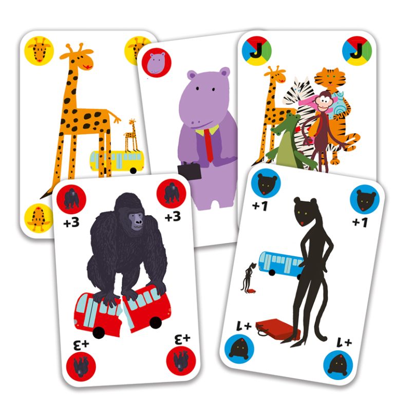– 4 Cartes “gorille” : ces cartes se posent sur une carte animal de la couleur de Bus correspondante ou sur la carte Joker (exemple : une carte gorille + Bus Jaune peut se poser sur une carte Zèbre + Bus jaune). Dès que cette carte est posée, tous les autres joueurs doivent taper sur le gorille. Le dernier joueur à taper, pioche 3 cartes de pénalité et redémarre avec une carte animal de son choix (il ne peut pas jouer une carte gorille ni la carte Joker).