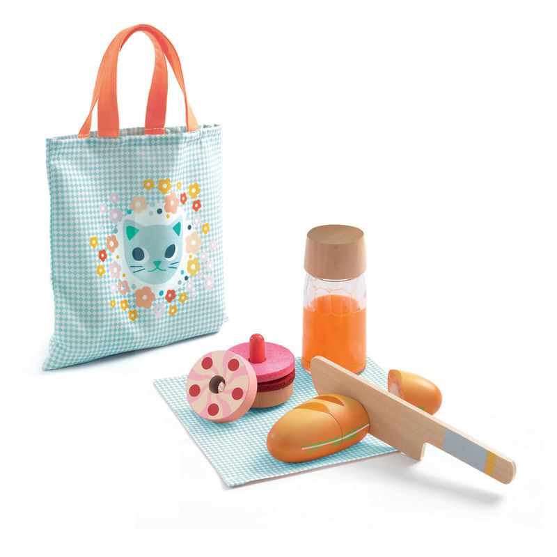 Ce set pique-nique du chaton et son sac contient tout le nécessaire pour s’inventer de délicieux pique-niques ! De la préparation au repas, votre enfant orchestre tout de A à Z. Il commence par déposer la nappe et mettre sa serviette. Prêt à manger ? Il coupe son sandwich puis déguste son gâteau sans oublier de s’hydrater avec la gourde magique. Quand le pique-nique est terminé, il range tout dans le joli tote bag inclus.