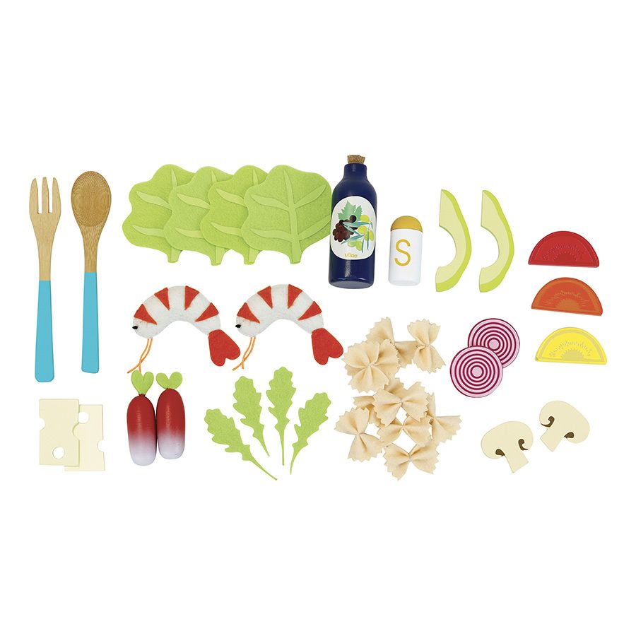 Amuse-toi et compose des salades variées ! Un kit de salades à composer parmi les 40 pièces en bois et feutrine : 1 grand bol en fibre de bambou, 2 couverts à salade, 1 bouteille de vinaigrette, 1 salière, 2 tranches de champignons, 2 tranches d’avocat, 4 tranches de tomate , 2 radis, 2 oignons, 11 farfale , 2 crevettes, 4 feuilles de roquette et 4 feuilles de chêne, 2 tranches de fromage. À partir de 3 ans.