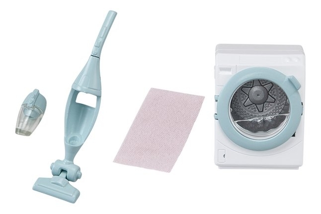 Cet set comprend un aspirateur dont une partie se retire pour former un aspirateur à main, une machine à laver et une serviette. Le tambour de la machine tourne en actionnant la molette sur le côté.