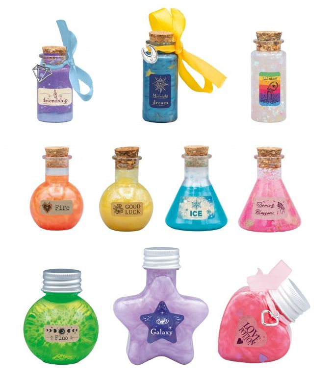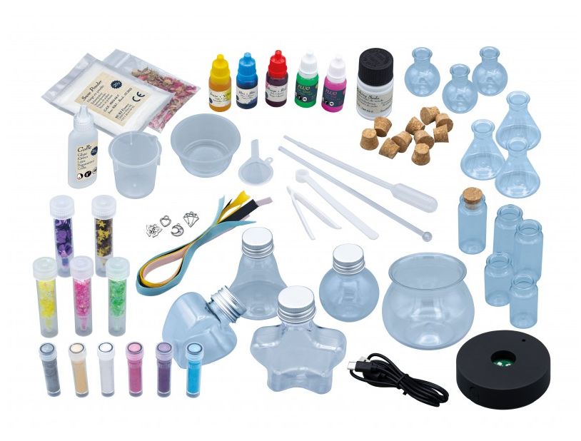 Décore-les avec les pigments nacrés, les confettis, les rubans et les breloques. Grâce à la base lumineuse, transforme ta potion en magnifique veilleuse.