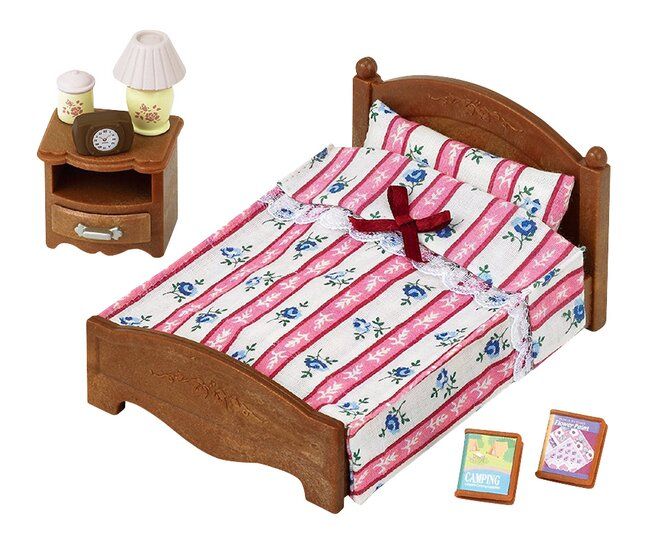 Lit plus large qu’un lit d’enfant, fourni avec sa table de chevet, 1 matelas, 1 couverture, 1 oreiller, 2 livres, 1 lampe, 1 réveil et 1 boîte de décoration.