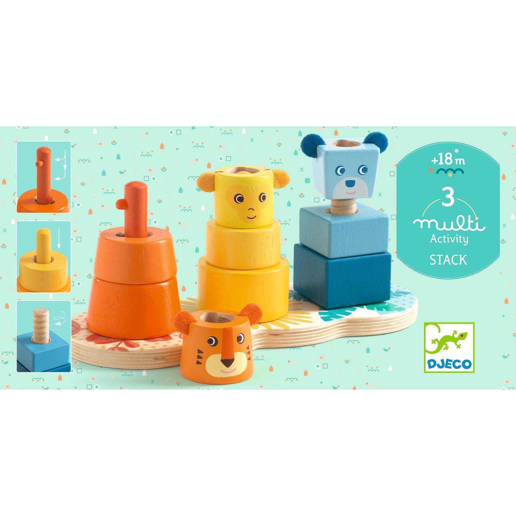 Multi Stack est un jouet en bois qui fait découvrir à l’enfant 3 manières différentes d’empiler. Chaque pyramide est un animal de couleur différente et chaque axe demande un geste différent : l’enfant empile sur l’axe lisse, il visse sur l’axe en spirale et il pivote sur l’axe à clé. 3 animaux à découvrir : un singe, un lion et un ours.
