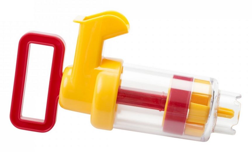 l’ouverture jaune lorsque la poignée est enfoncée. Grâce au corps transparent, les enfants peuvent observer le niveau de l’eau à tout