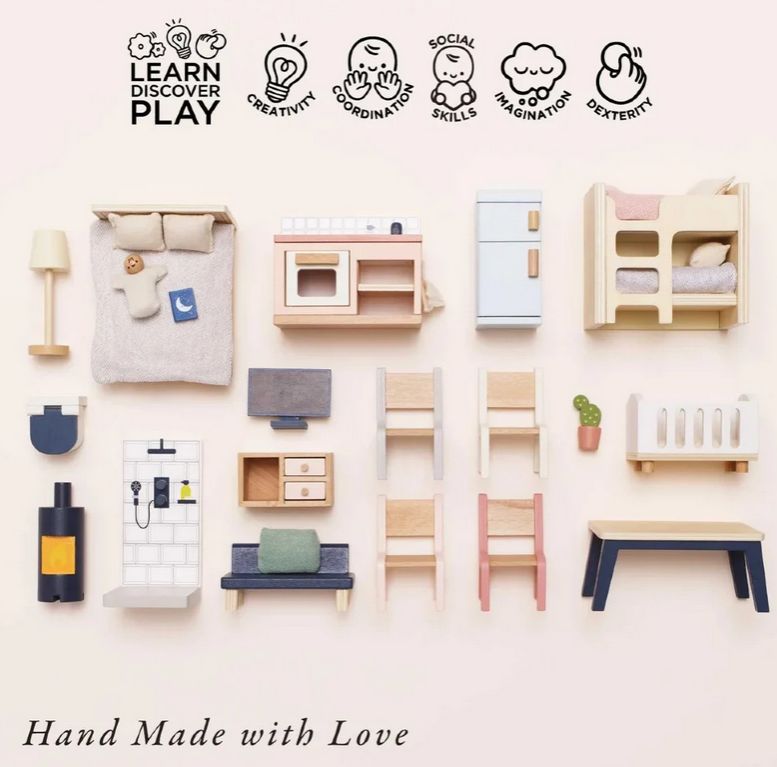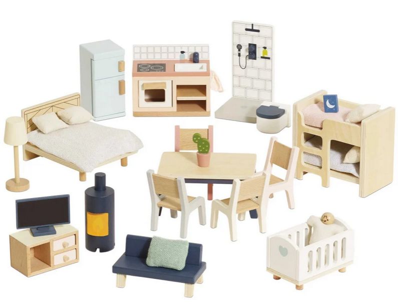 Commencez à meubler votre maison de poupée avec cet ensemble de démarrage idéal. Doté de lits superposés pouvant être séparés, four, comptoirs de cuisine, table à manger, vaisselle, commode, chambre d’enfant et accessoires de salle de jeux.