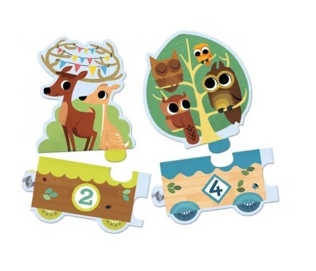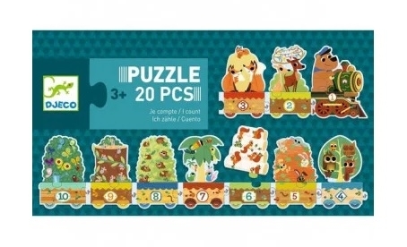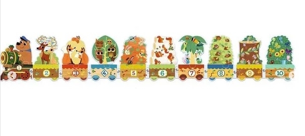 Un puzzle frise de 20 pièces à remettre dans l’ordre pour apprendre les chiffres, les quantités et la suite numérique grâce au train des animaux de la forêt.