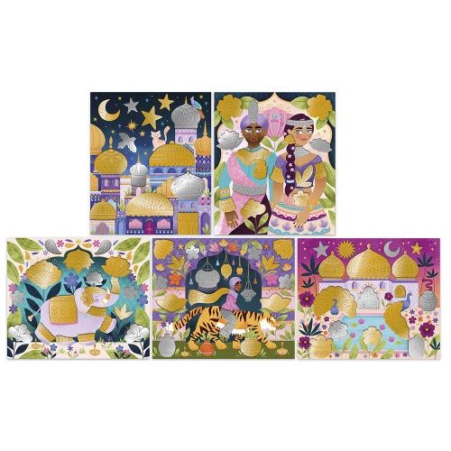 Direction : l’Inde et ses merveilles ! Ce kit créatif invite les enfants à partir de 7 ans à décorer 5 tableaux sur le thème Bollywood, le tout grâce à des stickers en métal dorés et argentés. Une nuit étoilée pleine de mystères, un palais éclatant et des animaux majestueux : pas de doute, vous voici plongés dans l’âme de l’Inde, où la spiritualité et la fête forment un tourbillon de couleurs. Avec ce coffret créatif, découvrez en famille la technique très facile et super efficace du métal à repousser. Il suffit de repasser sur les traits imprimés au verso des stickers avec le bâtonnet de bois pour voir des dessins apparaître ensuite au recto. Il ne reste qu’à coller les stickers sur les tableaux, et le tour est joué ! Cette pochette de loisirs créatif contient : 5 tableaux à décorer, 3 planches de stickers en métal, 1 bâtonnet en bois, et 1 livret avec les modèles et instructions. Les enfants profitent alors d’une activité calme et créative, qui nécessite patience et dextérité. Il faudra compter environ 25 minutes pour décorer chaque tableau. Laissez-vous transporter dans un kaléidoscope de couleurs vives, ou les saris chatoyants et les palais majestueux vous transportent au cœur de l’Inde !