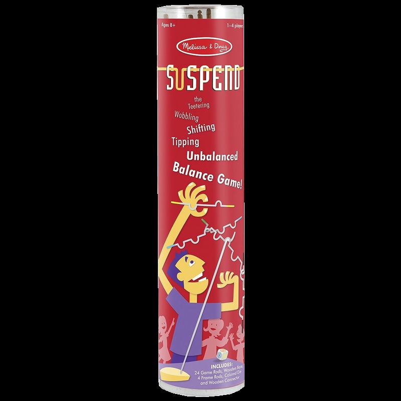 Suspend est un jeu d’équilibre et de dextérité, recommandé pour les enfants dès l’âge de 8 ans. À chaque tour, une nouvelle pièce est ajoutée à la sculpture verticale en constante transformation, ce qui provoque un ajustement de l’équilibre et hausse le niveau de difficulté. Suspend mettra vos nerfs à rude épreuve ! Il va falloir trouver votre équilibre ! Tirez au sort à l’aide d’un dé la pièce à placer (une baguette métallique plus ou moins longue avec de une à cinq encoches pour s’accrocher). Reste alors à la placer sur le mobile constitué des pièces déjà suspendues mais sans les faire tomber ! Vous récupérez les pièces que vous faites choir : le premier qui n’a plus de baguettes à mettre ni dans sa réserve ni dans la réserve commune a gagné.